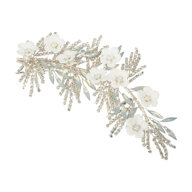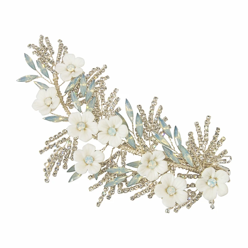 Athena Charlotte headpiece is a beautiful and delicate floral hairclip. An adjustable silver toned vine is embellished with high quality clear crystals and clay flowers and intertwined with opal coloured crystals. This headpiece is fitted with a crocodile clip for perfect security!