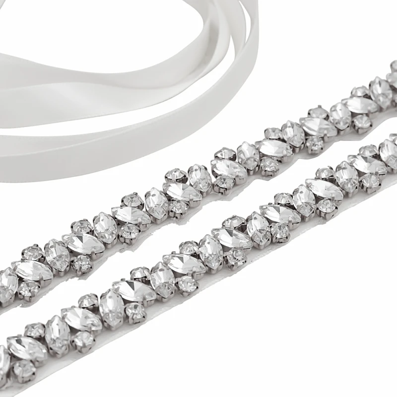 Athena Collection – Crystal Cluster Belt. Add a touch of sparkle with this stunning, slim wedding sash belt to any wedding gown! A slim line belt embellished with different cuts of clear crystal finished with ivory satin ribbon.