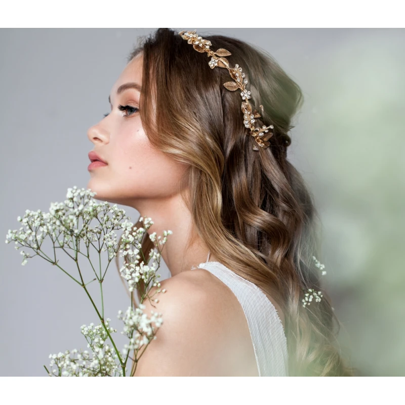 Athena Dazzling Luxe hair vine is a really pretty and delicate hair vine. Sparkling crystals are set in a floral and Metallic gold vine leaf pattern. Dazzling Luxe can be worn like a tiara or pinned to the side or back of the hair!