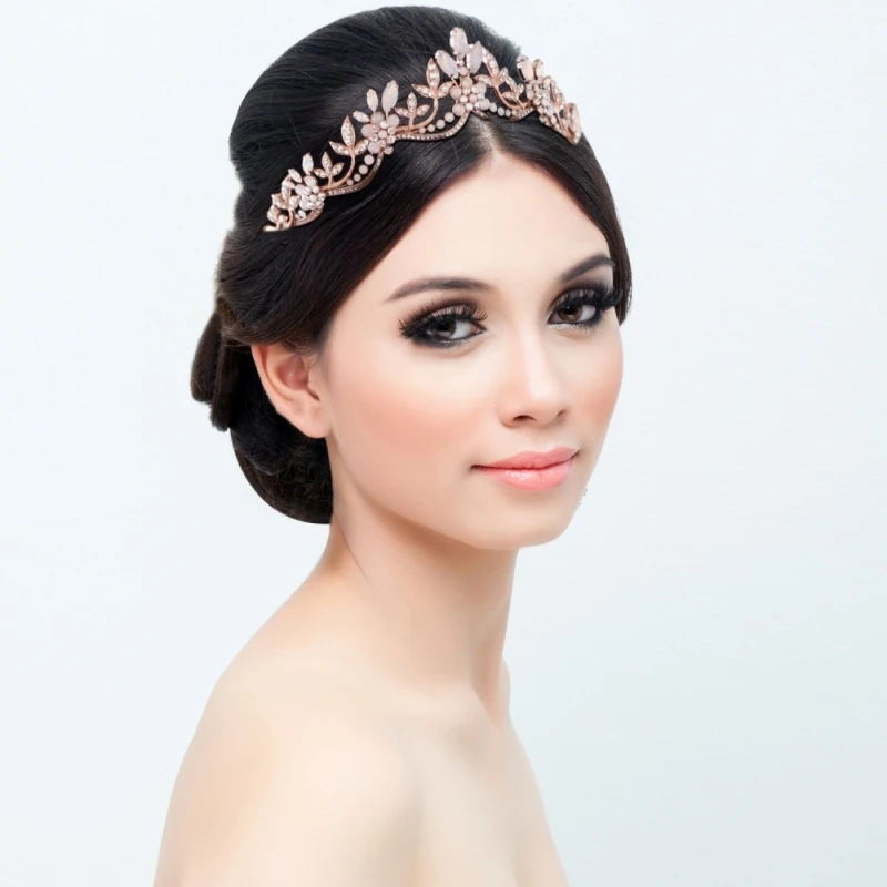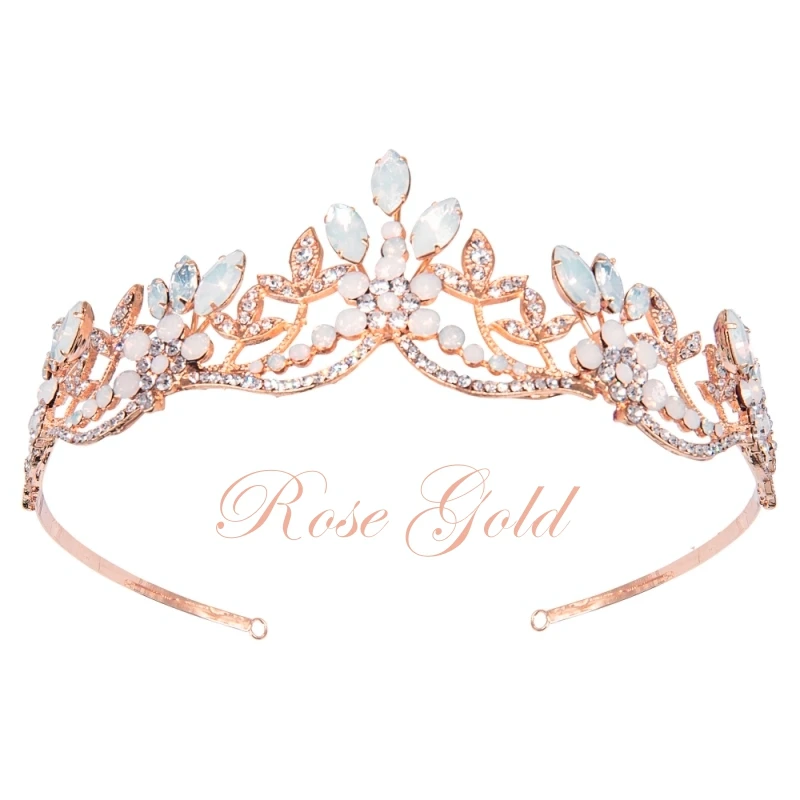 Athena Collection Eternal Luxe Tiara. A stylish and chic medium sized tiara for brides and bridesmaids with elegant pavé set curves offset against a translucent bed of brilliant cut crystals rising to pear shaped crystals at the apex. This perfect symmetrical headpiece allows for a subtle shimmer and a high shine rose gold finish!