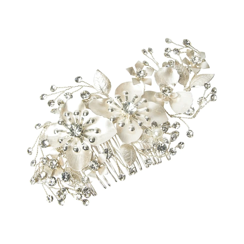 Athena Exquisite Floral is a crescent shaped wedding comb with hand painted petals and clear, sparkling crystals. An elegant and stylish curved shape comb with white, crystal studded petals wound around the silver vine and clear crystals are scattered within the petals. The comb can be worn in a variety of different hairstyles!