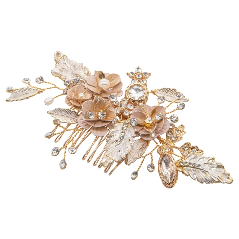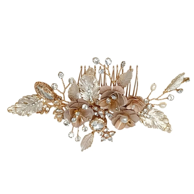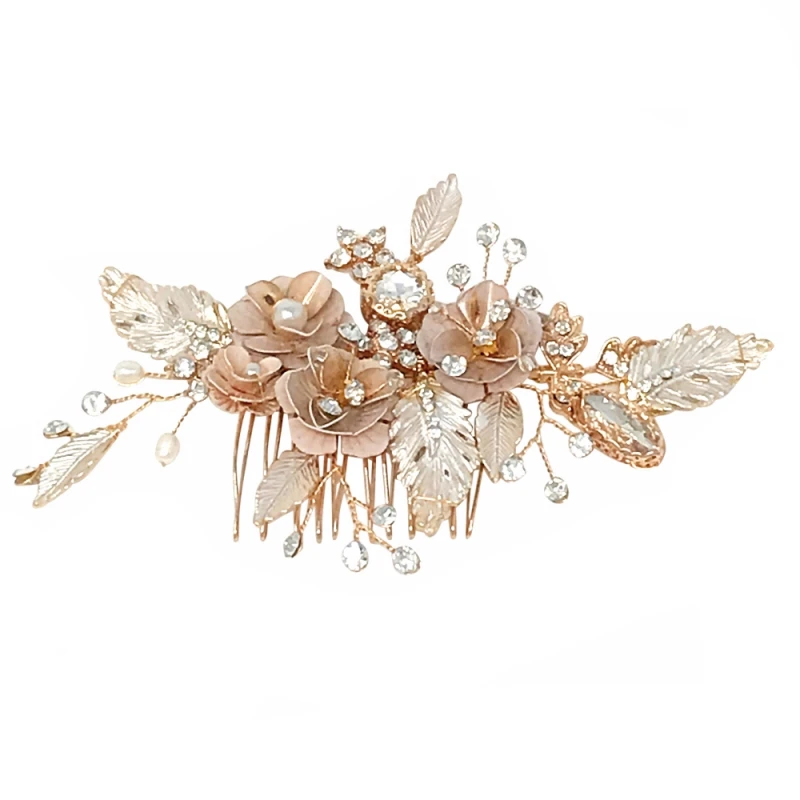 Athena Glitzy Pink Blush Hair Comb. A beautiful hair comb using high quality crystals , dainty hand painted leaves and pink blush petals to create something beautiful and ethereal within an interwoven vine pattern that allows the bride to be comfortable!