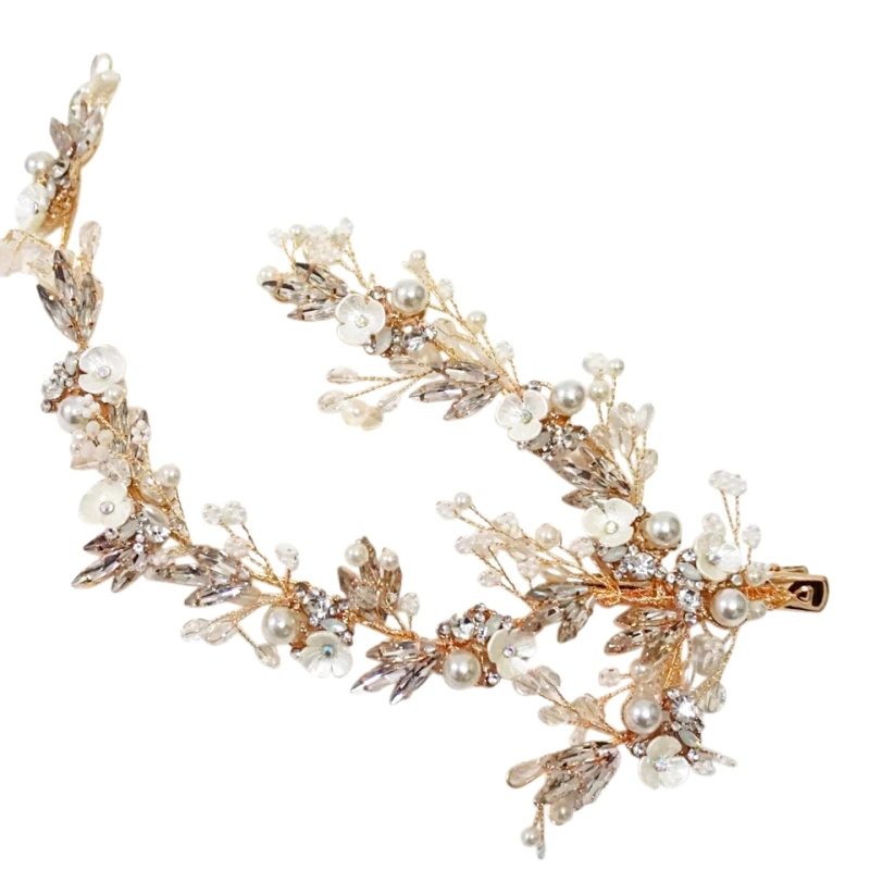 Athena Gold Extravagance bridal hair vine. A beautiful, romantic, floral hair vine using high quality clear crystals and Marquise crystal leaves, seed pearls and simulated ivory pearls encased with dainty petals on a high shine golden vine, attached to a gold coloured crocodile clip!