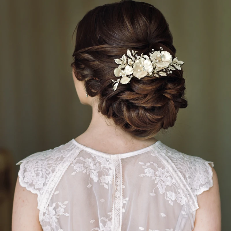 Athena Shimmering Bridal is an adorable wedding comb with hand painted petals and clear, sparkling crystals. An elegant and stylish comb with hand painted silver , crystal and pearl studded petals wound around the silver vine and clear crystals are scattered within the petals. The comb can be worn in a variety of different hairstyles!