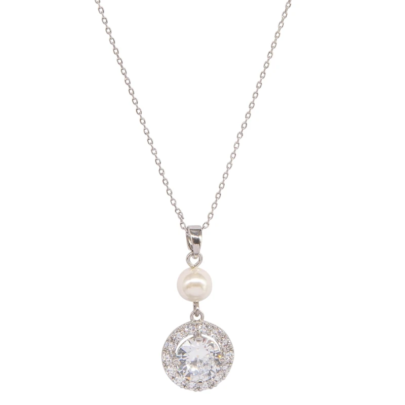 CZ collection Dainty Starlet Pendant Necklace. Classic crystal necklace set in a timeless design with clear AAA cubic zirconia crystals on a silver plated finish dropped from an ivory pearl! A pretty and simple Art Deco inspired design with a subtle shimmer!