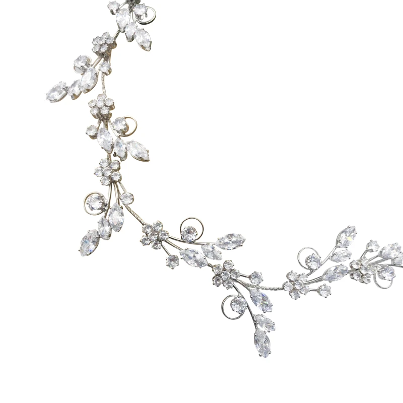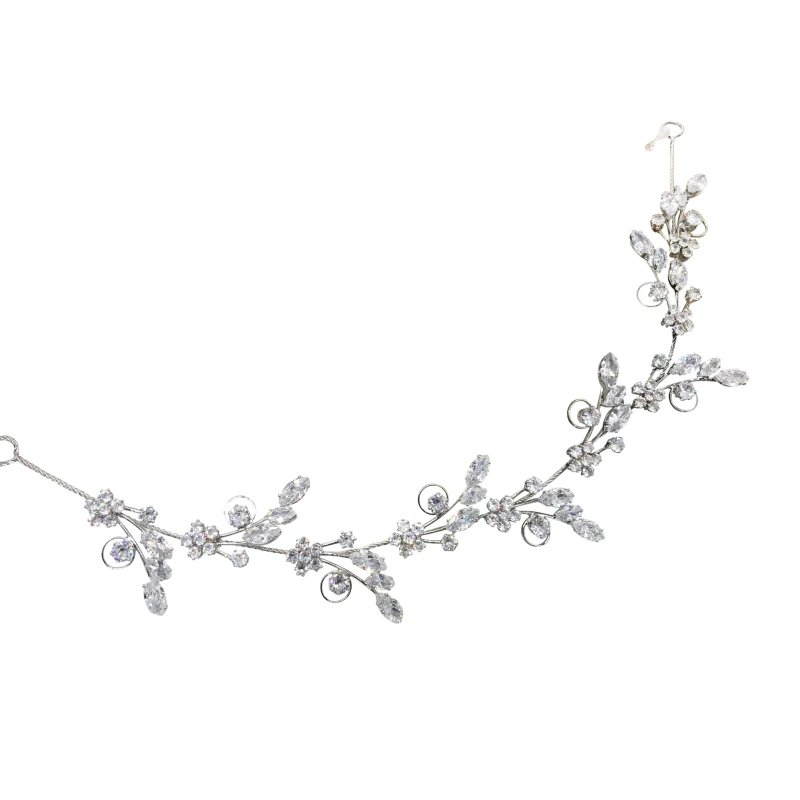 CZ Collection – Exquisite Sparkle is composed of Marquis cut crystal leaves, sparkling crystal forget-me-nots on a Silver finish hair vine. A chic and luxurious bridal hair vine. An elegant trailing vine style bridal vine accented with lustrous crystal vines…can be worn across the forehead in a Bohemian style.