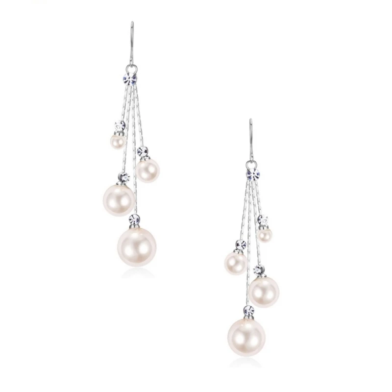Athena Cubic Zirconia Collection Pearl Drop Earrings. Elegantly designed and sophisticated Chandelier style earrings with clear cz crystals and a simulated ivory pearl, finished with silver plating. Four variable length drops with crystal and pearl at the bottom of each!