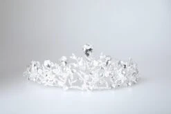 Enchanting silver hair vine – intricately designed with attention to details – embellished with freshwater ivory pearls, clear crystals and hand painted silver flowers on a silver finish flexible wire. Complete with white ribbon. Size is 32cm long and 5cm wide at the widest point.