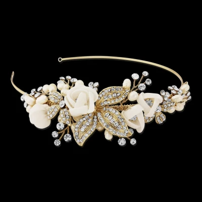 Clara fabric rose headband in Gold. For the bride who needs roses in her wedding day look the pretty fabric swirl rosettes are set against sprays of ivory pearls and luxury Swarovski crystal set leaves for a summery, vintage look!