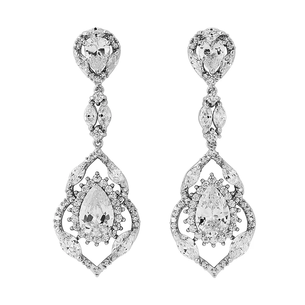Cubic Zirconia bridal earrings in a stunning vintage-style design with intricate teardrop and swirl shapes for an elegant finishing touch!