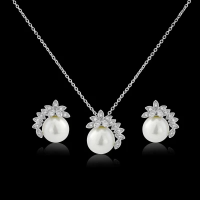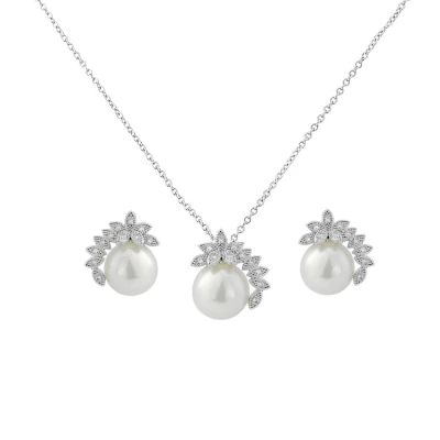 Athena Collection Chic Pearl Necklace set. A feminine and utterly stylish, pearl design delicate pendant necklace set with pretty matching pearls and cz crystals on a silver finish. The matching earrings are a stylish and delicate stud design of a single pearl and embellished with crystals!