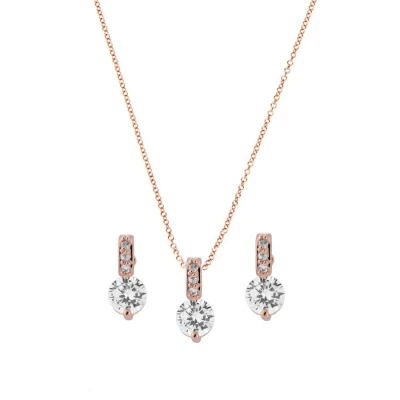 Athena Collection Classic Crystal Necklace set in Rose Gold. A feminine and utterly stylish, cubic zirconia drop design necklace set with pretty cz crystals. The matching earrings are a stylish design of cz crystals!