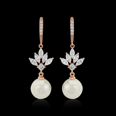Athena Crystal Elegance chandelier style earrings in a gatsby inspired design. Embellished with clear crystals and simulated ivor pearls on a rose gold finish!