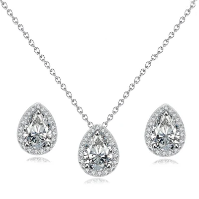 Athena Collection Dainty Gem Necklace set. A perfectly stylish, teardrop design pendant necklace set with pretty, sparkling cubic zirconia crystals on a silver finish. The matching earrings are a stylish teardrop crystal stud design!