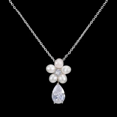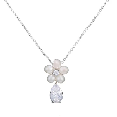 CZ collection Dainty Pearl and cubic zirconia necklace in Silver finish – Elegantly designed with clear cubic zirconia crystals on a pearl flower design and solitaire stone. A pretty and simple design with a lovely sparkle!
