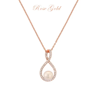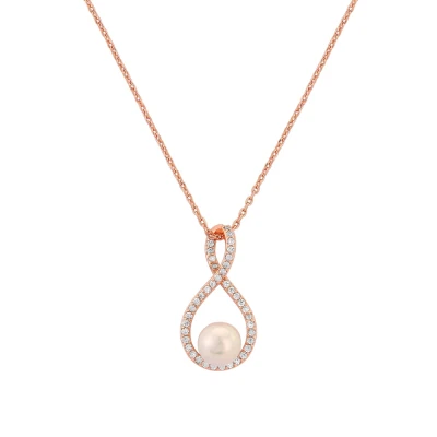 Athena Collection Exquisite pearl and crystal necklace in Rose Gold. A beautiful unique swirl design necklace set with a pretty ivory solitaire pearl and a swirl of cz crystals on a cz paved Rose Gold plated finish!