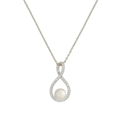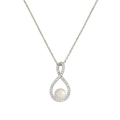 Athena Collection Exquisite Infinity pearl and crystal necklace in Silver. A beautiful unique swirl design necklace set with a pretty ivory solitaire pearl and a swirl of cz crystals on a cz paved Platinum plated finish!