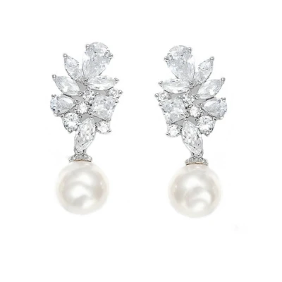 Athena Cubic Zirconia Collection Majestic Pearl Earrings. Stylish pearl earrings in a unique and glamourous design embellished with cz crystals and complete with a simulated ivory pearl – rhodium plated!Â