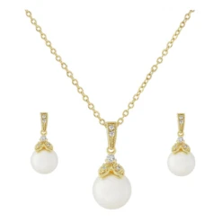 Athena Collection Precious Pearl Necklace set in Gold. A feminine and utterly stylish, pearl drop design necklace set with pretty solitaire simulated pearl and cz crystals. The matching earrings are a stylish design of drop pearls and crystals!
