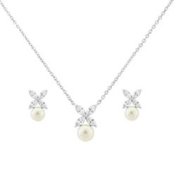 The Simply Chic Necklace set is a beautiful, vintage-inspired necklace set with pretty pearl and cz crystal detailing and matching stud earrings. This design of bridal necklace set looks stunning with a delicate ivory lace wedding dress to add a light, feminine finishing touch!