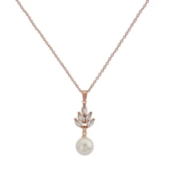 CZ collection Vintage Pearl Drop necklace cubic zirconia and pearl necklace in Rose Gold – VIntage inspired design with clear cubic zirconia crystals on an elegant rose gold plated finish. A pretty leaf inspired design with a single pearl drop and a lovely sparkle!