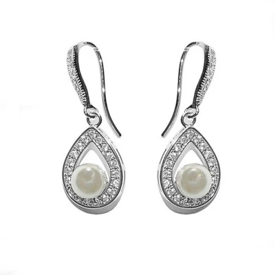 Athena Cubic Zirconia Collection Precious Pearl Earrings. A petite and pretty, feminine design embellished with cz crystals and ivory pearls on a rhodium plated finish!