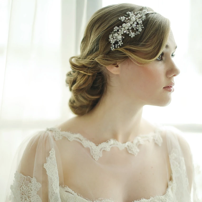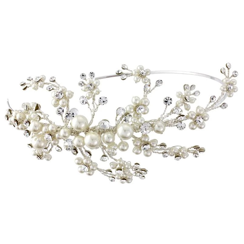 Darcey pearl spray bridal headband. A stunning, illusion effect bridal headband with beautiful vine sprays set with sparkling Swarovski crystals and accented with lustrous ivory pearls for a classic finishing touch!