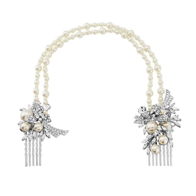 The Elite Collection Enchanting headpiece is a true statement hair accessorie! This designer headpiece has two beautiful cz crystal and pearl combs with gleaming clear cz crystals and ivory pearls that are interlinked with two glamorous strings of simulated ivory pearls to create a truly glamorous look!