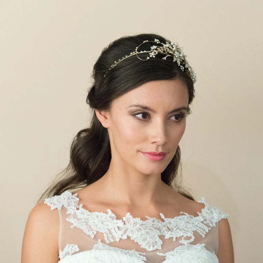Ivory and Co Amber gold wedding headband. A stylish and romantic style piece with a fluid spray and floral design crafted using pavé set crystal flowers and leaves, sprays of clear crystal florettes and sprays of lustrous freshwater pearls