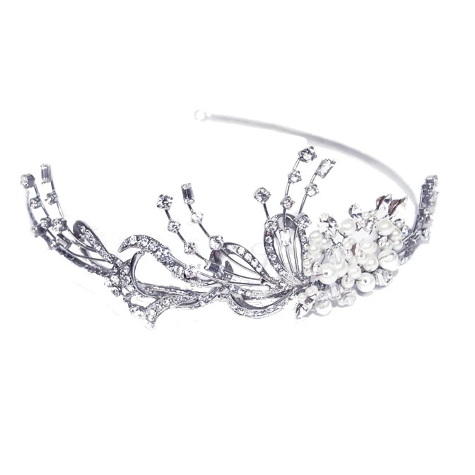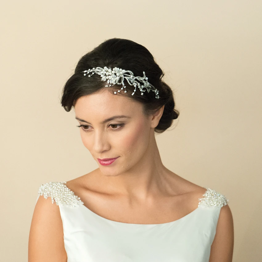 Ivory and Co Anastasia flapper bridal headband. A stunning, spray design inspired by the roaring twenties with pretty crystal and pearl florettes. This stunning headband can be worn across the head in an alice band style or across the forehead with the design  low down.