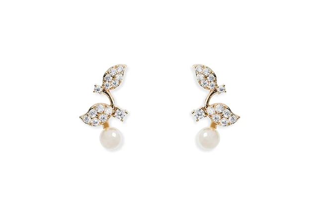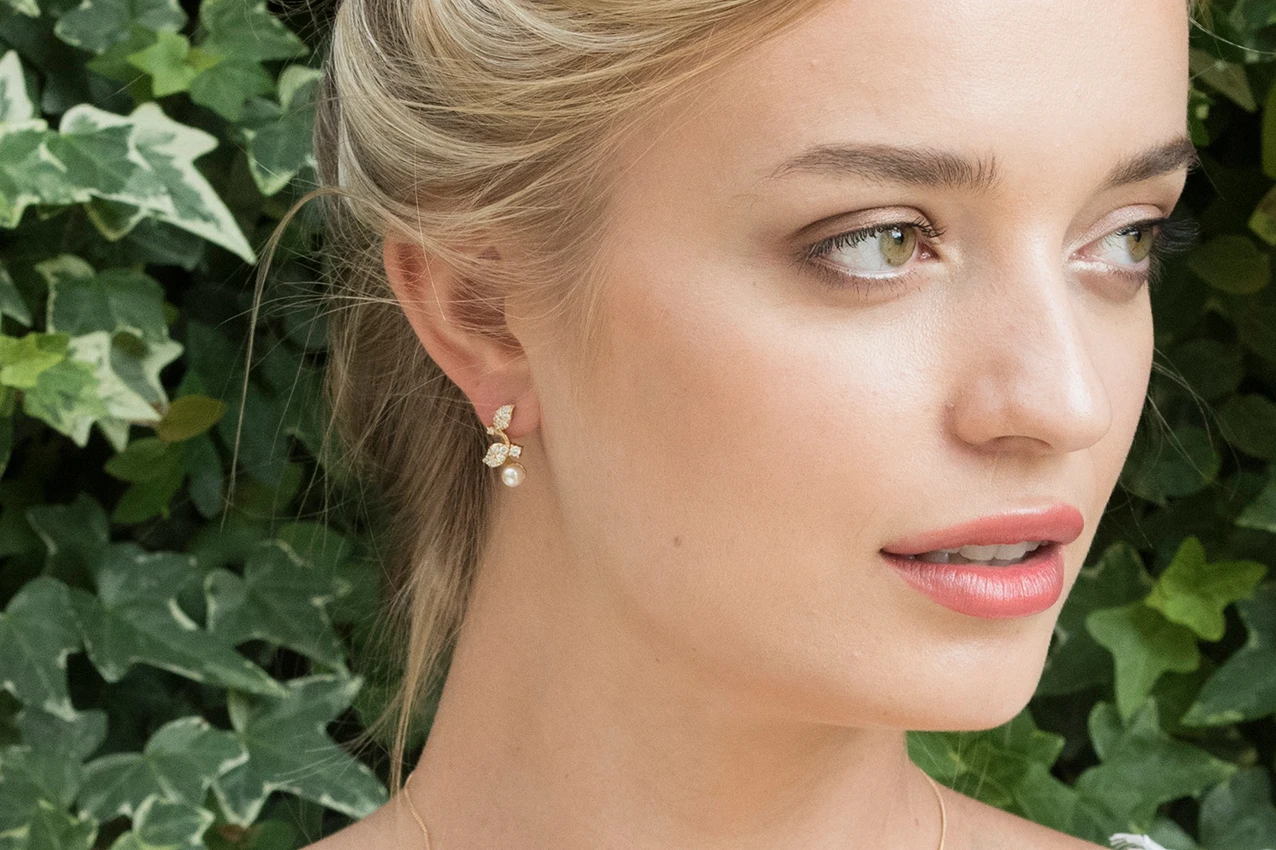 Ivory and Co Aphrodite Gold Earrings. Beautiful, luxury bridal earrings with stunning sculptured leaf detailing in gold plating and a pretty, lustre pearl droplet. Perfect for brides wanting subtle jewellery that is not too small to be noticed!