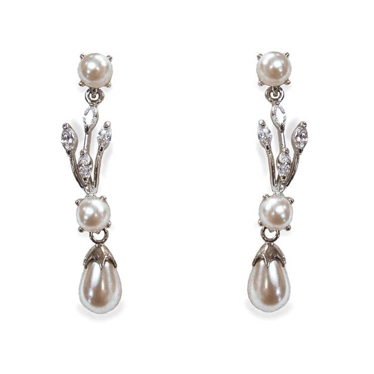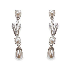 Belgravia earrings by Ivory and Co. made with Russian man-made diamonds (cubic zirconia) and man-made pearls. Elegant, drop shaped earrings with modern styling which look just like real diamonds!