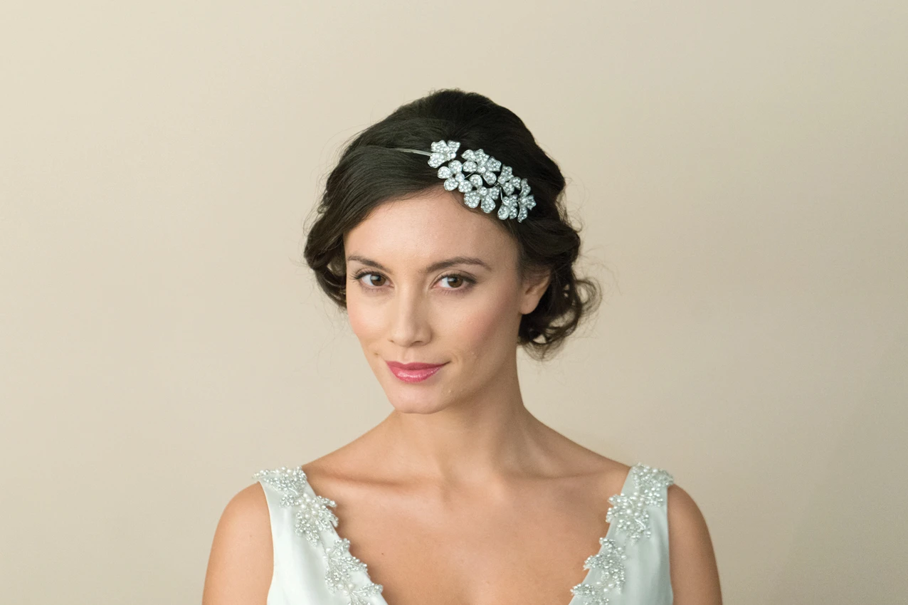 Ivory and Co Ceylon crystal headband tiara. A sophisticated bridal headpiece – sparkling solitaire stones are set in an intricate pattern of flower petals on the side of the band!Â