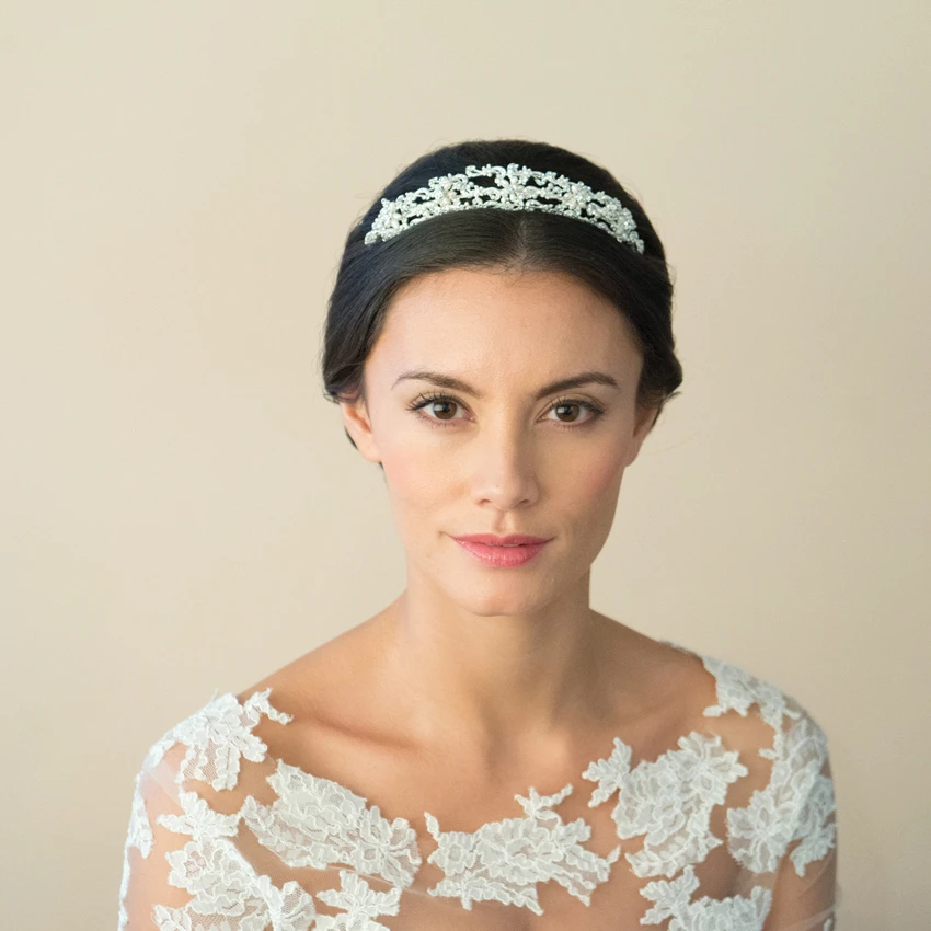 Ivory and Co Claudette tiara. A Grecian influenced headpiece, with a recurring pattern of sweeping crescents crafted from solitaire stones and surrounded with freshwater pearls.