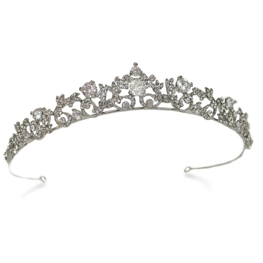 Clementine tiara by Ivory and Co using swarovski crystal and cubic zirconia. A stunning low height tiara influence by Victorian design incorporating curls offset with solitaire stones.