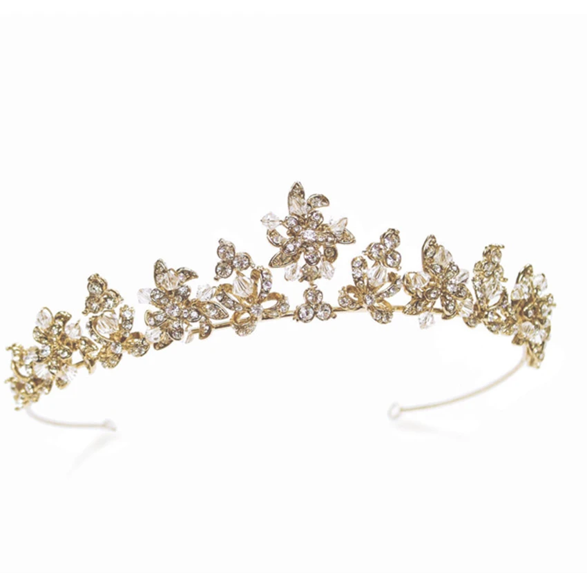 Ivory and Co Cornelia tiara. A delicate and dainty tiara, with sparkling solitaire stones set in floral patterns, accented by shimmering beads.