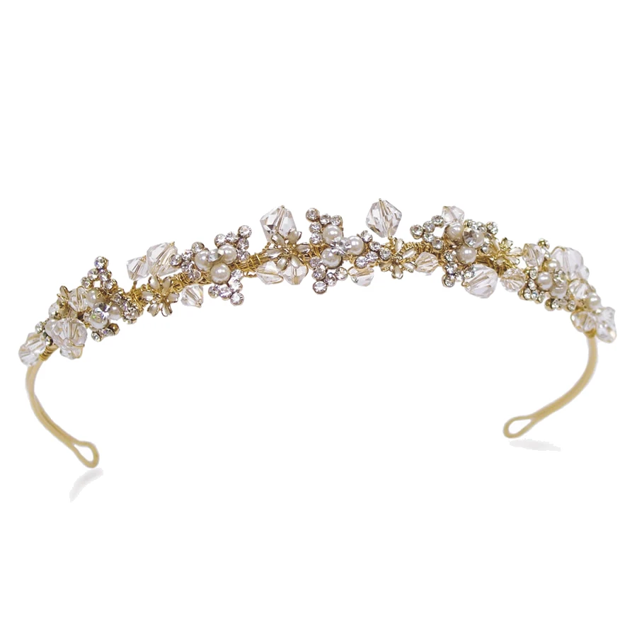 Ivory and Co Courtney gold pearl alice band. A warm tone golden wedding band embellished with clusters of ivory pearls, Swarovski crystals and shimmering beads for a subtle finishing touch!