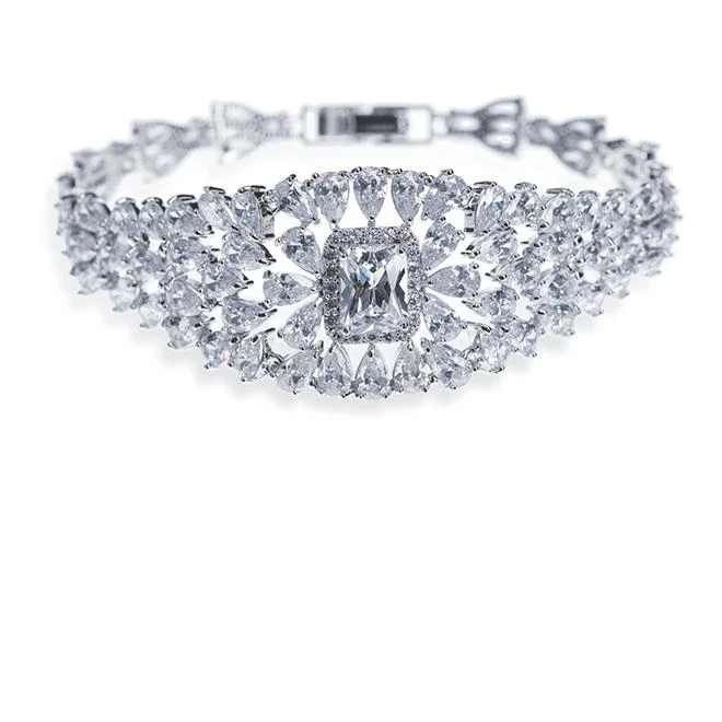 Ivory and Co Dorchester Bracelet is a very special design. A beautiful arrangement of tear shaped stones make up this intricate and dazzling pattern set around a princess cut stone with tiny pave stones for extra sparkle. That bride that wants a designer look with their jewellery will absolutely stand out from the crowd in this bracelet!