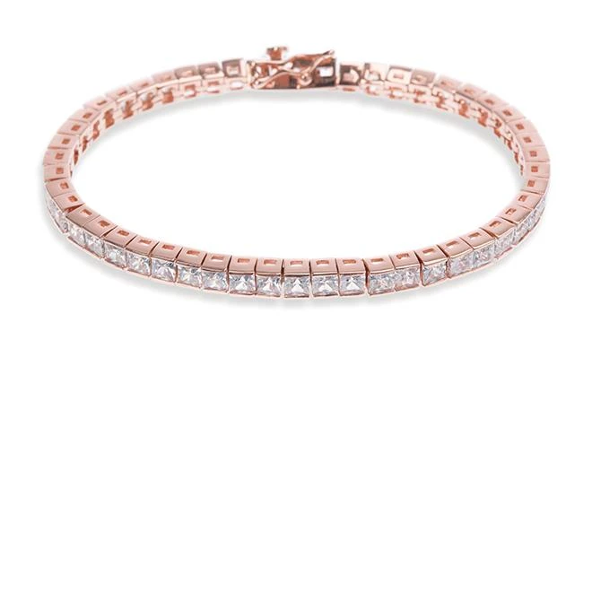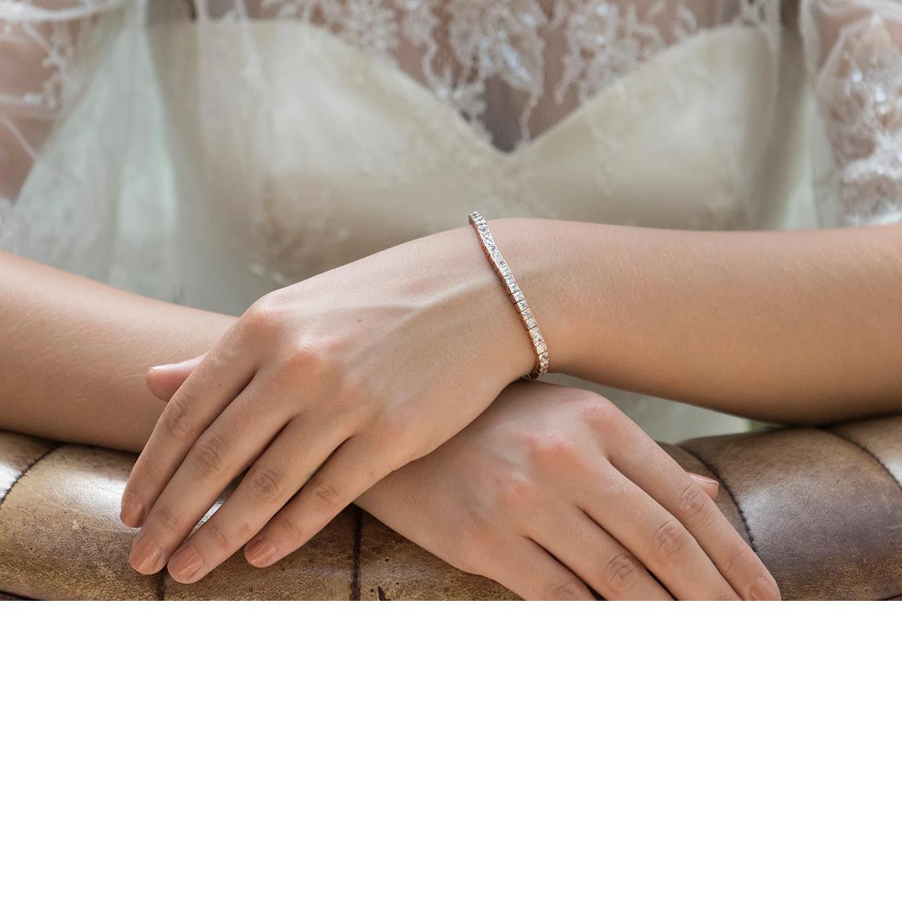 Ivory and Co Elegance Rose Gold Tennis Bracelet. As the name suggests this is a very elegant tennis bracelet. Square cut stones are surround set and this bracelet is extremely popular as it complements so many different style wedding gowns. This delicate bracelet is understated and subtle but still sparkly and sophisticated!