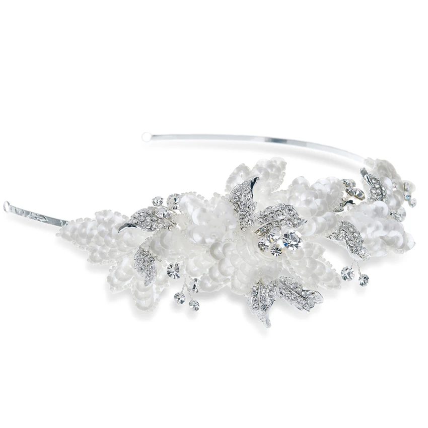 Ivory and Co Evita. A simply exquisite hairpiece with vintage chic inspiration, with pearlised sequins and dainty beads attached to the organza backed pearls, with cut solitaire stones creating sparkling leaves.