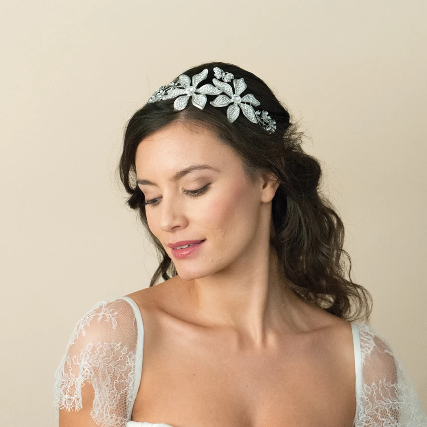 Ivory and Co Goddess. A unique and stunning headpiece, with two large, sparkling, feature flowers with exquisite crystal centres, crafted from solitaire cut stones, surrounded by interwoven garlands of flowers.