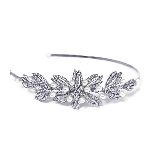 Halcyon pearl and crystal headband tiara by Ivory and Co. An on-trend and truly unique side heabdband with a bold, leaf design set with sparkling crystals and finished with pearls for a classic finishing touch!
