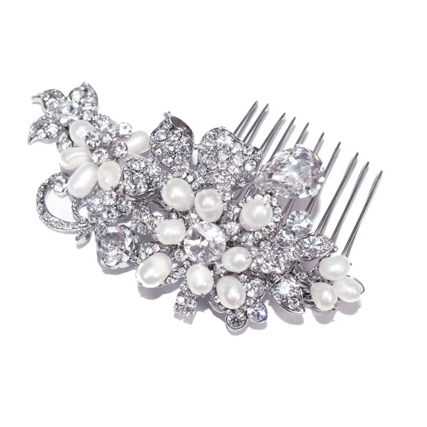 Ivory and Co Harmony comb. Vintage style pearl and crystal comb with elegant crystal studded leaves set against freshwater pearl flowers and large Swarovski crystals for a touch of glamour!