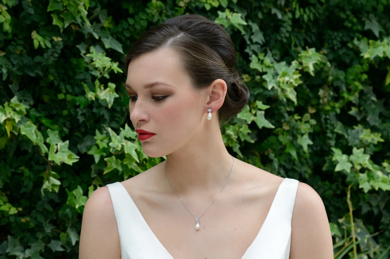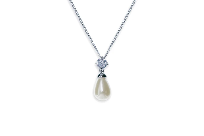 Ivory and Co Imperial Pearl Pendant is such a popular style for all brides as it will simply complement any style of wedding dress. The pendant is made up of a single solitaire and pear cut man-made diamonds. Simply elegant and versatile!