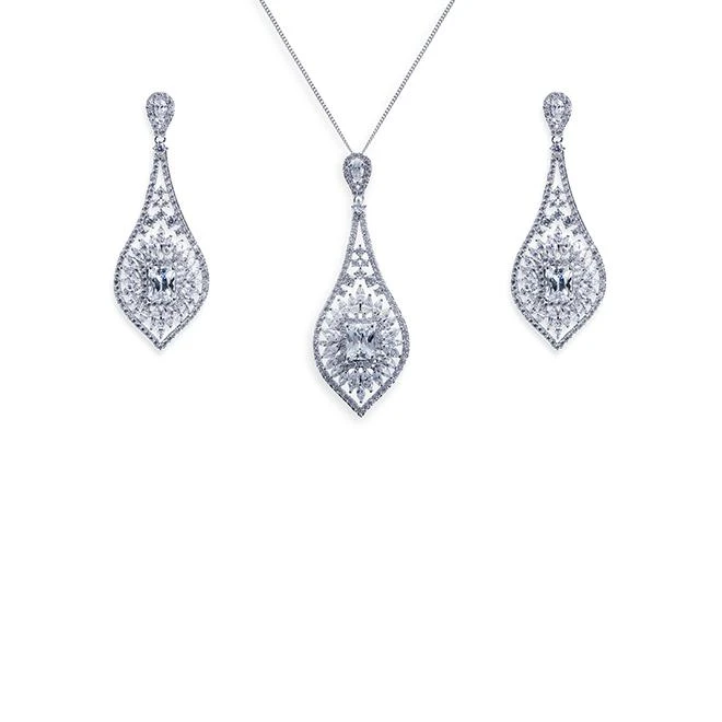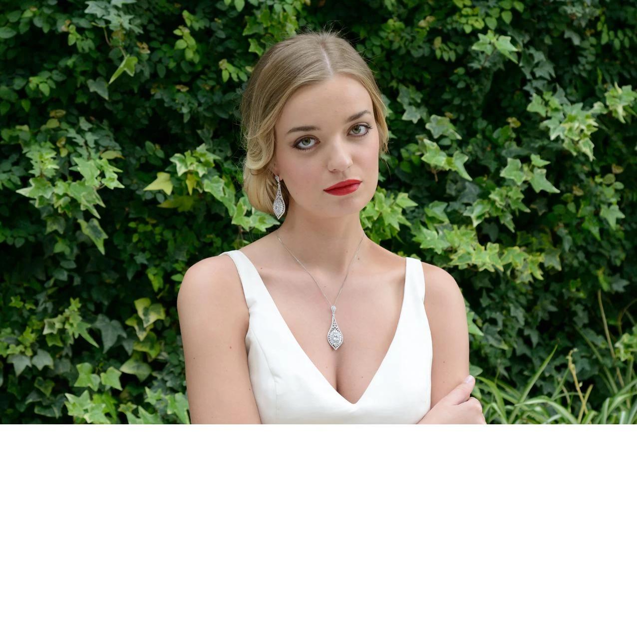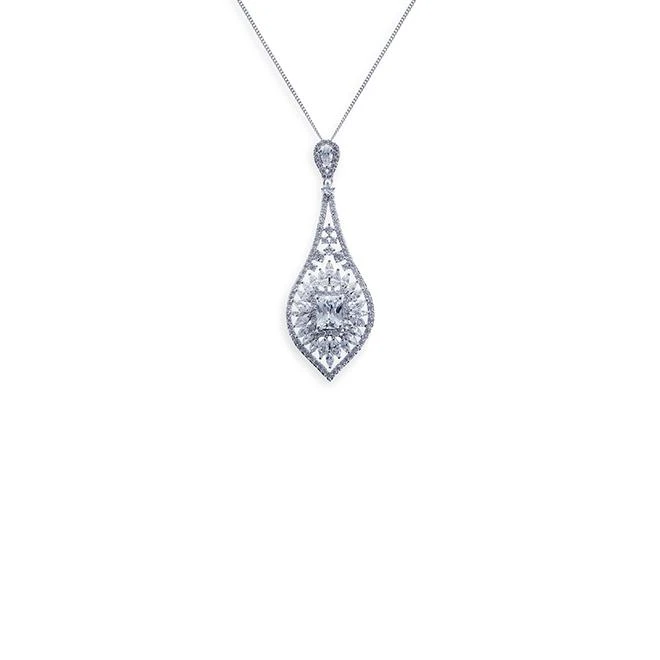 Ivory and Co Jefferson. A totally dazzling and delicate pendant, inspired by a vinatge feel from the 1920’s. This pendant would best complement a sophisticated and elegant bridal gown. The detailed pattern is set around a sparkling princess cut stone!