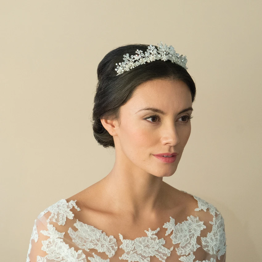 Laluna is a delicate yet statement headpiece – the clusters of stones set against delicate pearls are crafted into a huge crown shape for the bride who demands a fairytale look!