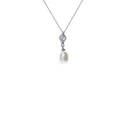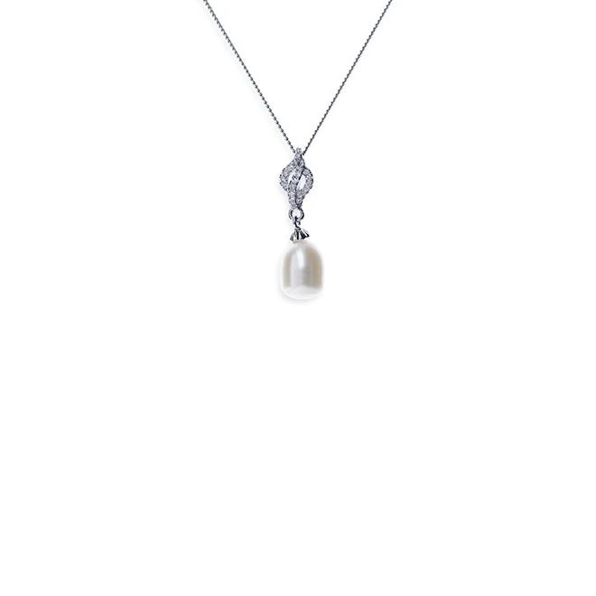 Ivory and Co Lisbon Pendant. This pendant is complete sophistication. A single pearl hangs below an intricate design of pave set stones! Simple in their elegance and ideal for brides wanting classic and delicate jewellery featuring pearls.