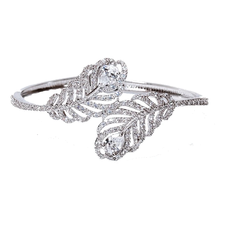 Ivory and Co Jewellery – Long Island Cuff Bangle. Contemporary and completely unique cuff bangle design which echoes deco styling with a luxury, peacock / father motif made using Swarovksi crystals and Cubic Zirconia.