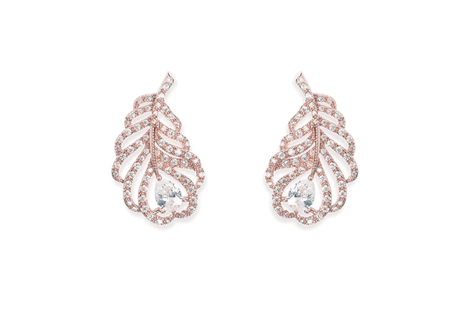 Ivory and Co Jewellery – Long Island Earrings. Stunning, Art Deco inspired feather earrings with a wafty swirl design set with Swarovski crystals and finished with a teardrop Cubic Zirconia stone!