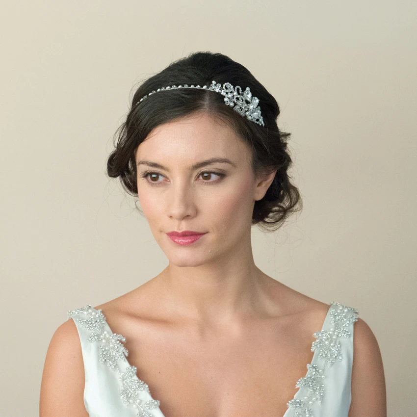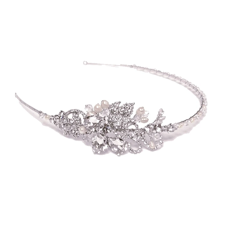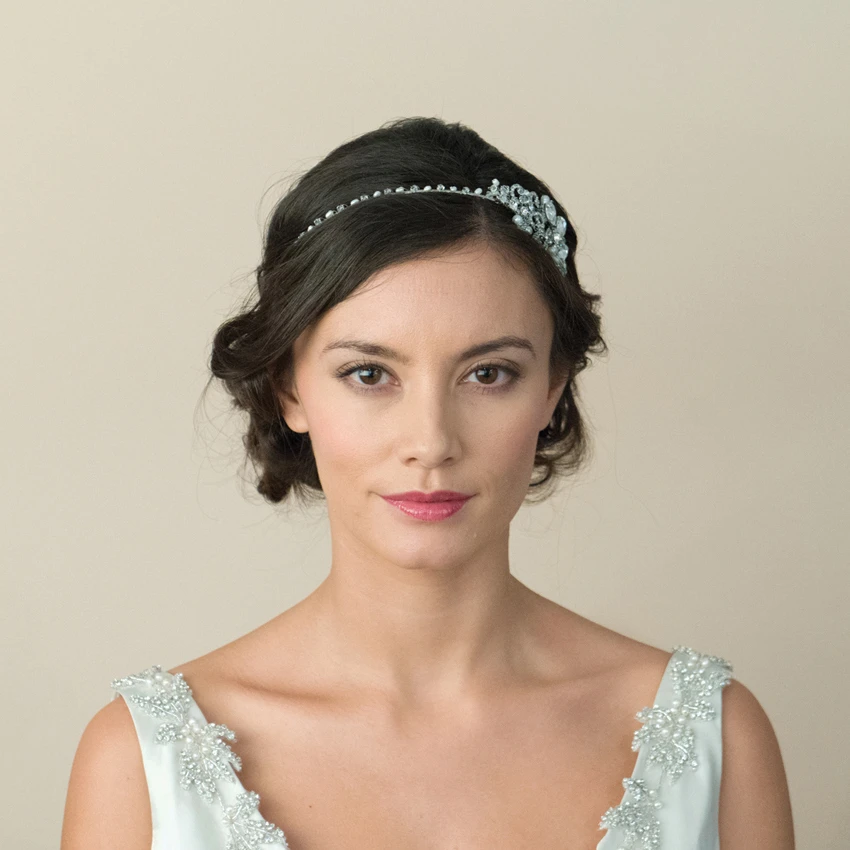 Ivory and Co Lucille Headband. An elegant, pearl and crystal headband with intricate, but comparatively subtle detailing. Lustrous freshwater pearls are offset against bold, teardrop crystals and a vintage-style crystal leaf design.